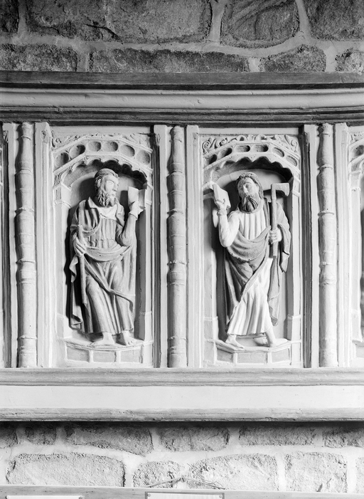Haut relief - Panneaux sculpté des 12 apôtres : Mur est du porche : saint Mathieu et saint Philippe.Immatriculation