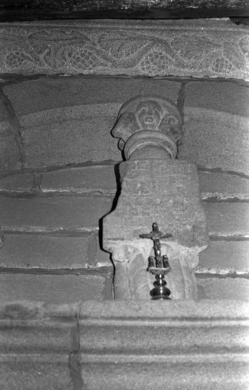 Grande salle basse, mur de refend en pierre de taille de granite, détail du dessus de la cheminée, armoiries et chapiteau déplacé (hotte en glacis sous arc mouluré), photographie de 1973. Une corniche en pierre règne sur la partie sommitale : on y retrouve une frise de végétaux ponctuées de grenadesImmatriculation