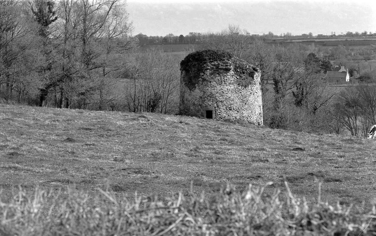 Colombier de la Chapellenie, vue de situation, élévation nord avec sa porte à linteau droit, photographie de 1973. En arrière-plan, le JaudyImmatriculation