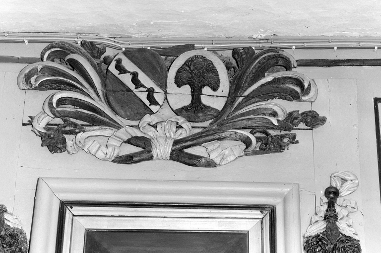 Lambris de cheminée, détail armoiries.Immatriculation