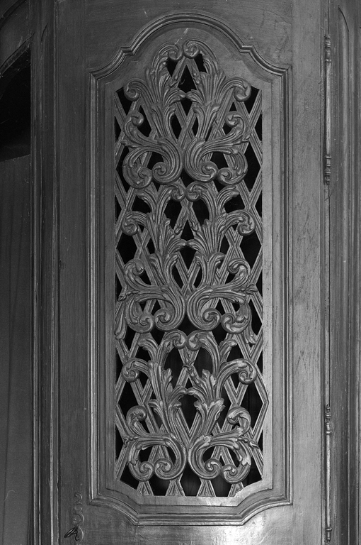 Confessional, bas-côté-nord, détail du vantail.Immatriculation