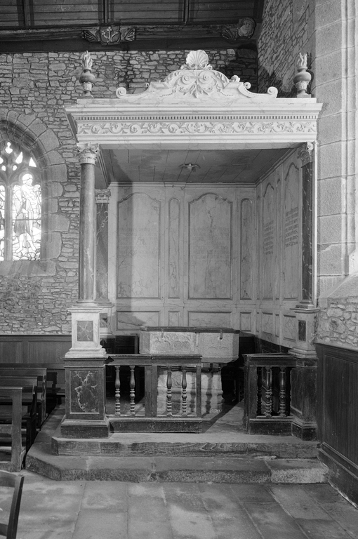 Baldaquin des fonts baptismaux, clôture des fonts baptismaux, lambris de demi-revêtement, église paroissiale Saint-Martin (Javené),