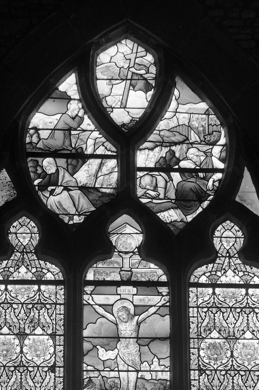 Baie 4 : Sacré-coeur ; Baie 5 : La Crucifixion, le Christ au jardin des Oliviers, église paroissiale Saint-Martin (Javené),
