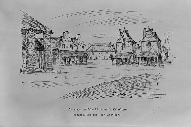 Dessin : La place du marché avant la révolution. (Baulon)Immatriculation