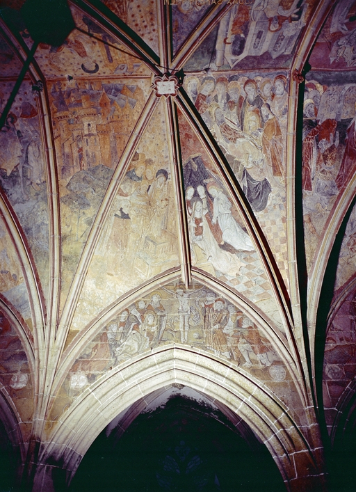 Fresques du choeur, vues générales : Ville de Jérusalem - Jésus au milieu des docteurs - Ange annonçant à la Vierge qu'elle va mourir - Dormition de la Vierge - Crucifixion.Immatriculation