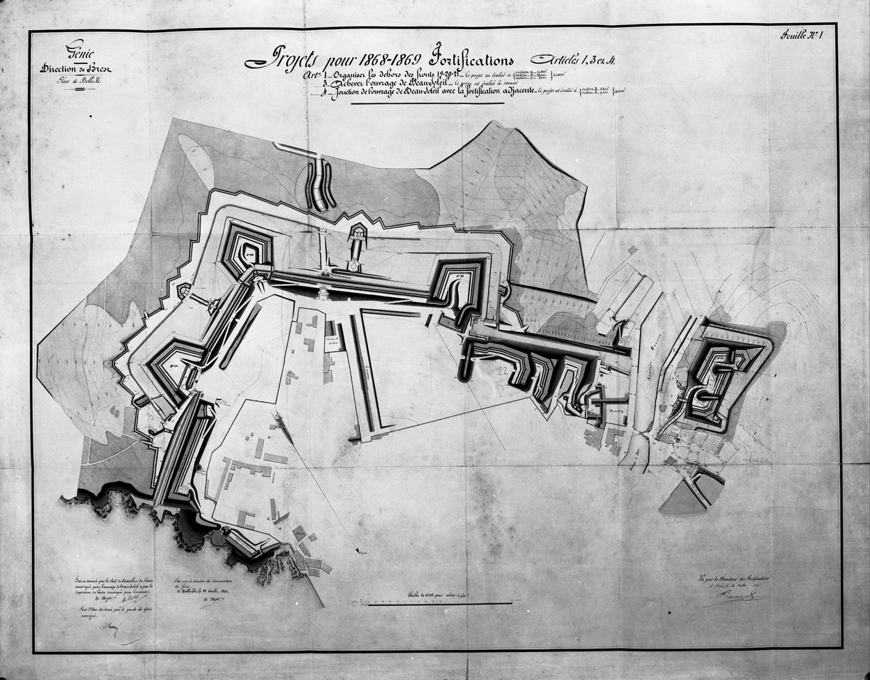 Génie, direction de Brest, place de Belle-Ile, projets pour 1868-1869, fortifications 1, 3, 4 par Hugon 22 avril 1868, échelle 1/1000e (Vincennes, Fortification, art8, sect1, carton 17)Immatriculation