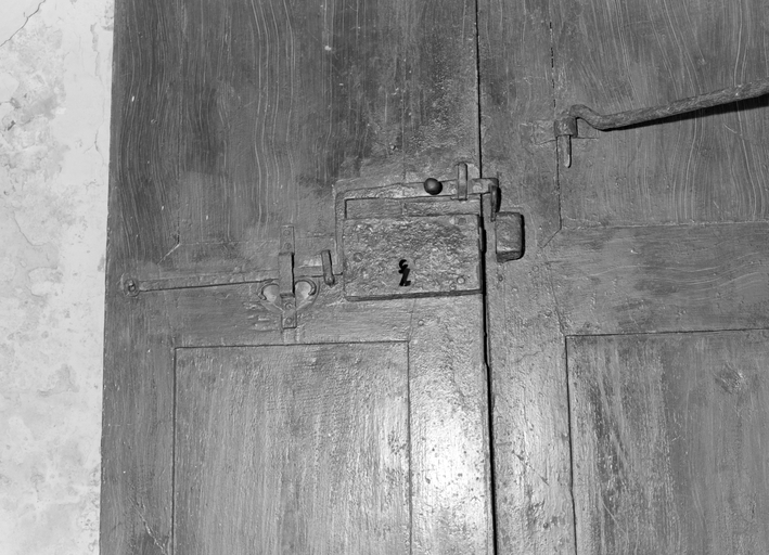 Vue de la porte sur cour prise du vestibule, détail du système de fermetureImmatriculation