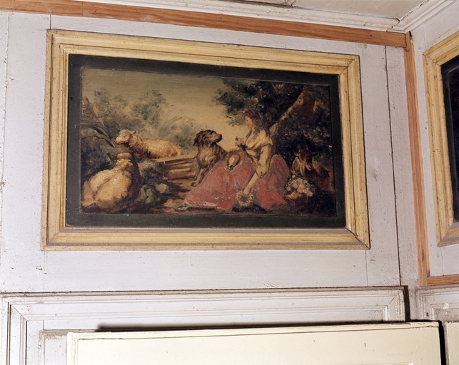 Maison 3 rue de l'église, dessus de porte et de cheminée de la pièce sud-est au 1er étage, mur nord, porte ouest, bergère et son troupeauImmatriculation