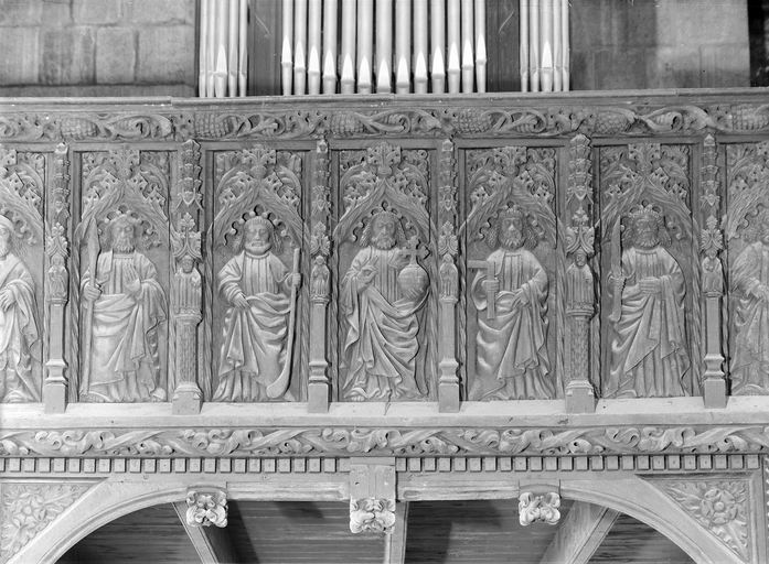 Plounévez-Moëdec, le bourg : église paroissiale Saint-Pierre, vue intérieure, détail des panneaux de la galerieImmatriculation