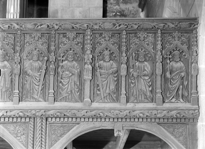 Plounévez-Moëdec, le bourg : église paroissiale Saint-Pierre, vue intérieure, détail des panneaux de la galerieImmatriculation