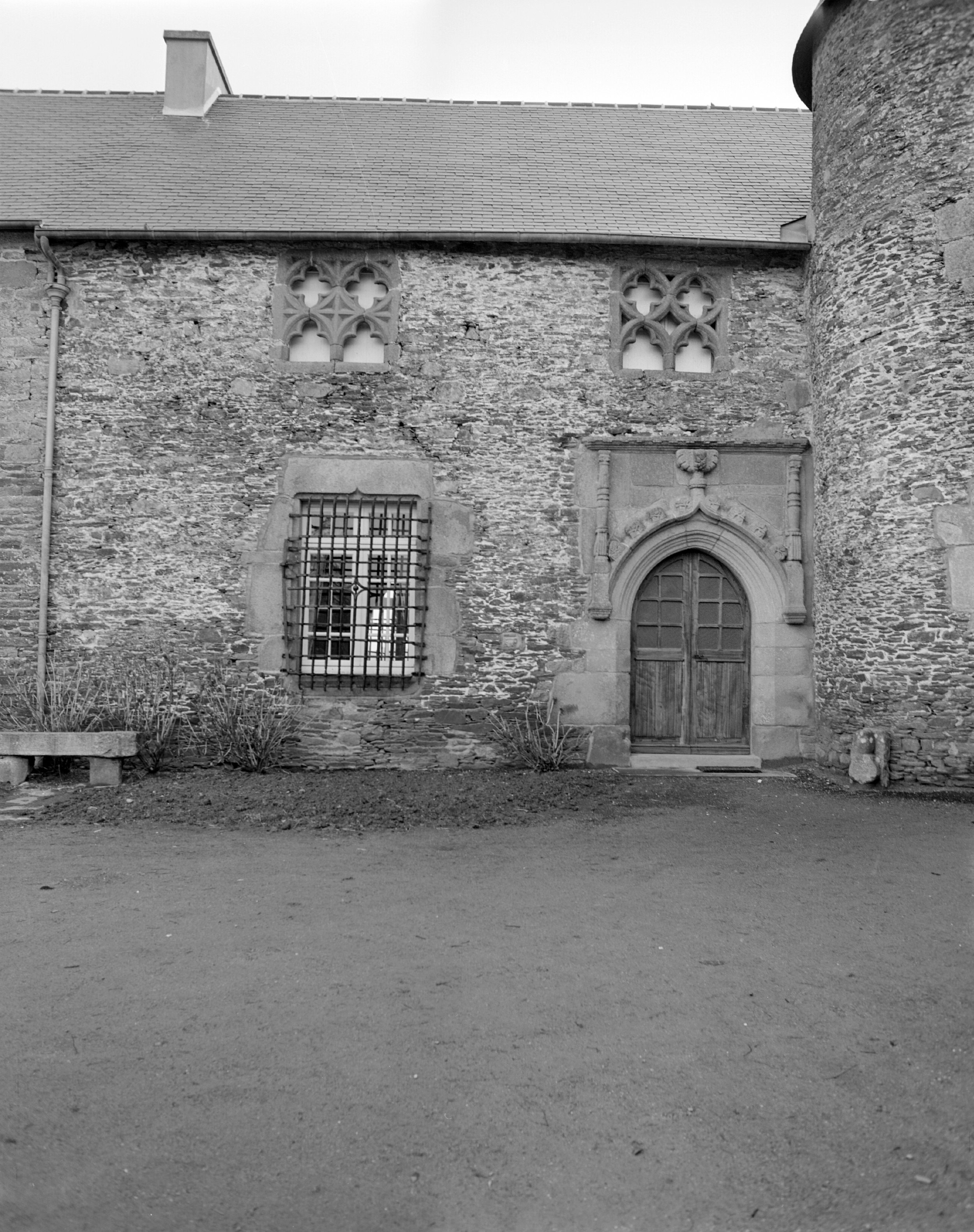 Détail de l'élévation nord, photographie de 1974. La façade conserve les parties supérieures de grandes baies gothique (quadrilobes et trilobes). Au rez-de-chaussée subsistait une grille défensive (aujourd'hui disparue)Immatriculation