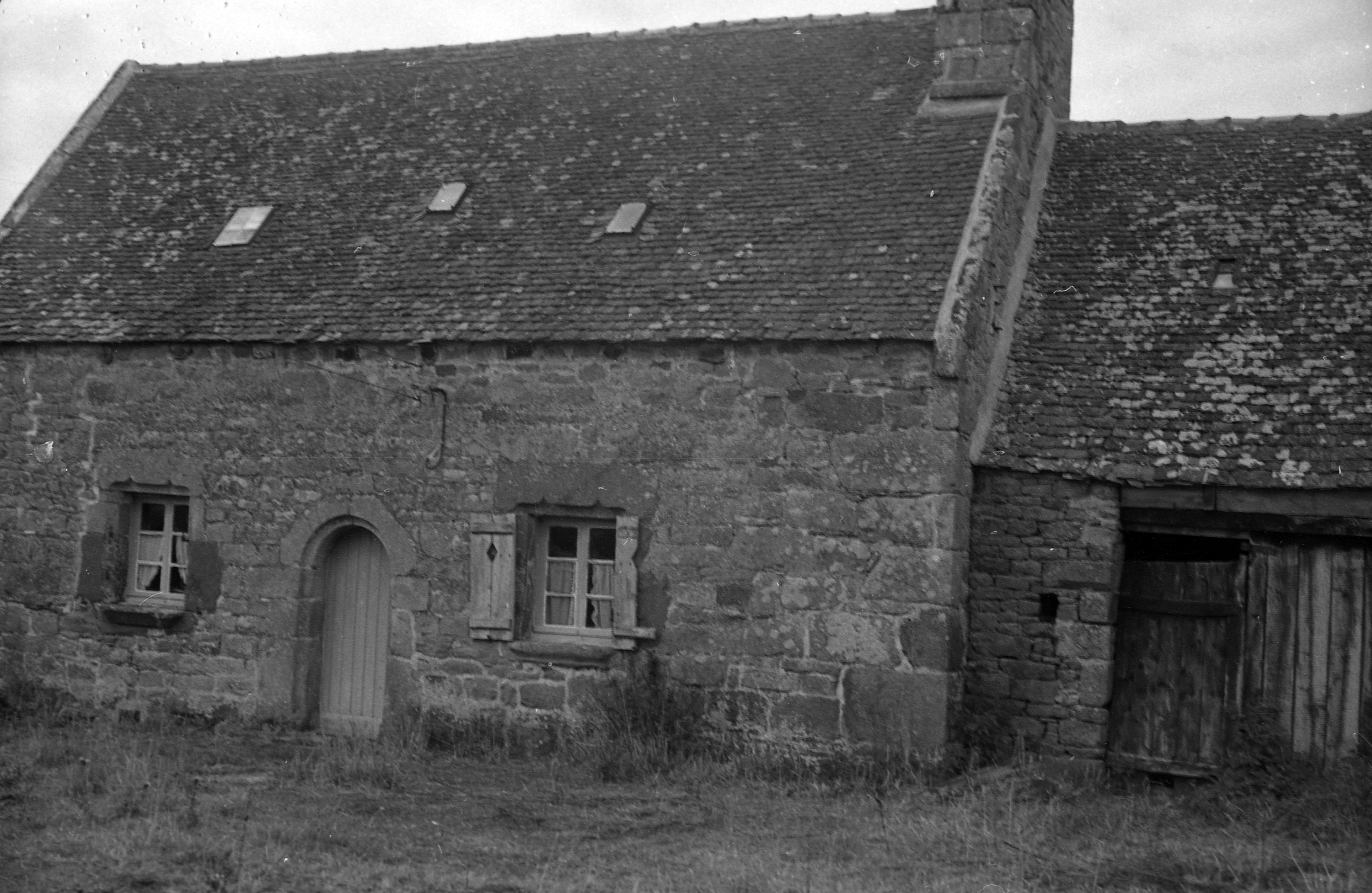 Plouzélambre, Kerbavé : logis, photographie de 1974. Cet édifice - vraisemblablement datable du milieu du 19e siècle - reprend des éléments anciens à savoir deux fenêtres à double accoladeImmatriculation