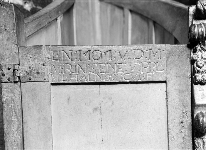 Porte de l'escalier, détail inscription : 1707Immatriculation