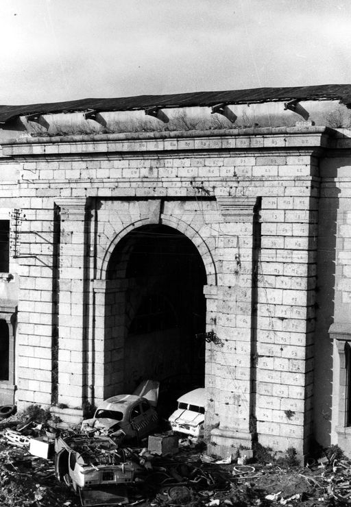 Vue générale Sud de la porte en février 1974 (les pierres ont été numérotées pour permettre un remontage)Immatriculation