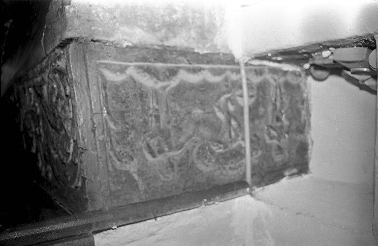 Guenoux ; cheminée, détail : linteau en bois, décor 'Adam et Eve au Paradis'Immatriculation