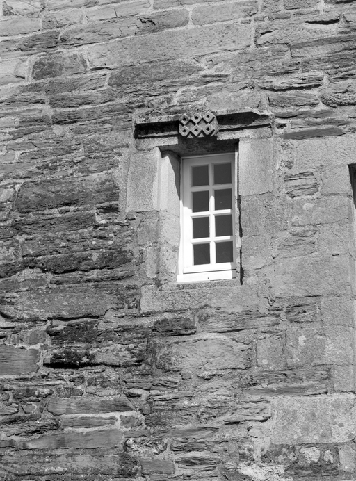 Aile ouest, détail : fenêtre avec blason remployé.Immatriculation