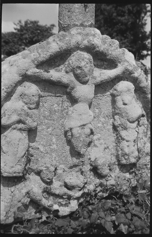 Croix de chemin : détail du bas-relief représentant le CalvaireImmatriculation