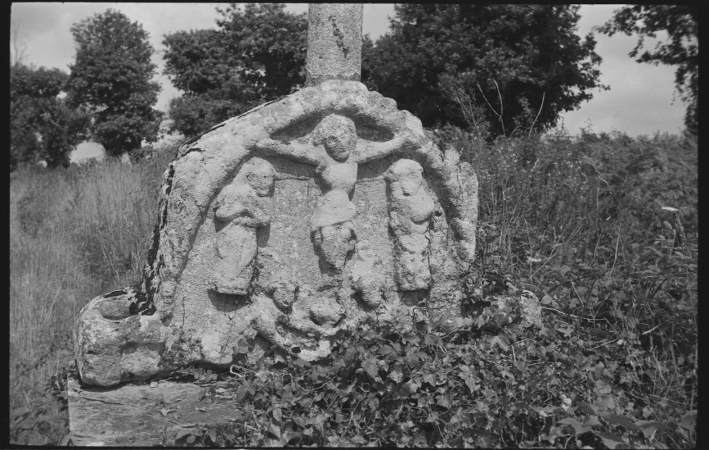 Croix de chemin : vue rapproché du bas-relief sculpté du socleImmatriculation