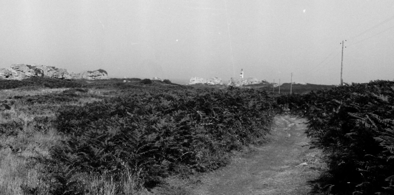 Bréhat, paysage de landes en direction du phare du Paon (cliché Sylvaine Laffiché, pré-inventaire, 1975)Immatriculation