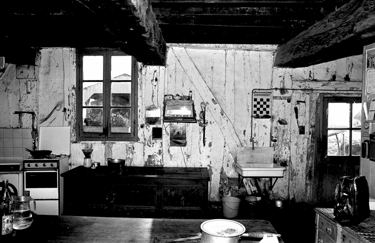 Vue intérieure, rez-de-chaussée : mur ouest, pan de bois ; état en 1975Immatriculation