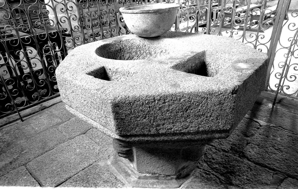 Réserve à eau baptismale, église paroissiale Saint-Caradec (Saint-Caradec-Trégomel),
