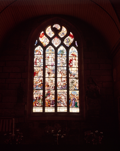 Verrière (maîtresse-vitre) : Passion, Résurrection, Jugement dernier, église Paroissiale Saint Hernin (Locarn),