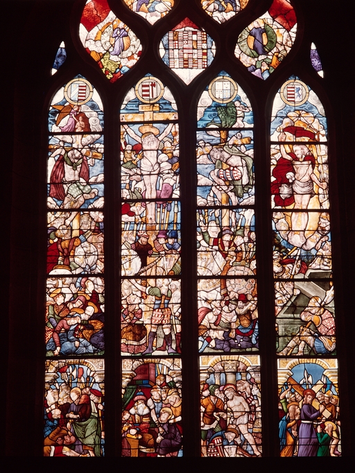 Verrière (maîtresse-vitre) : Passion, Résurrection, Jugement dernier, église Paroissiale Saint Hernin (Locarn),