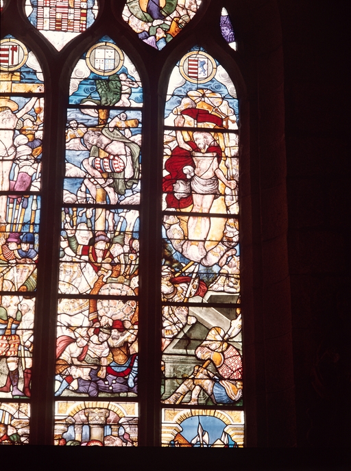 Verrière (maîtresse-vitre) : Passion, Résurrection, Jugement dernier, église Paroissiale Saint Hernin (Locarn),