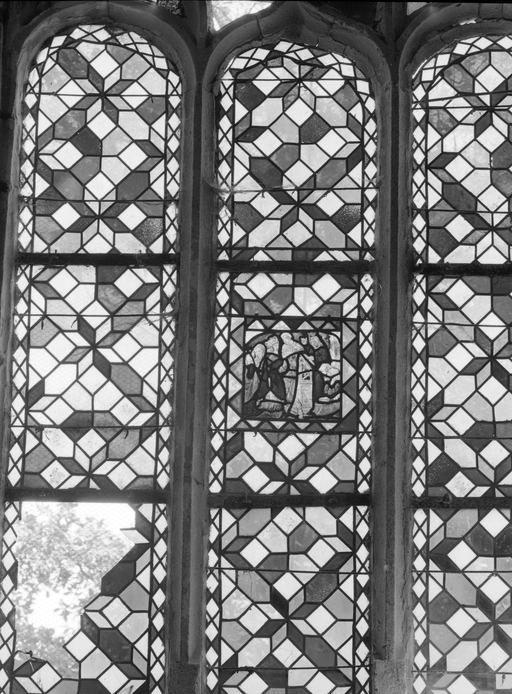 Fragment de vitrail ancien dans la maîtresse-vitreImmatriculation