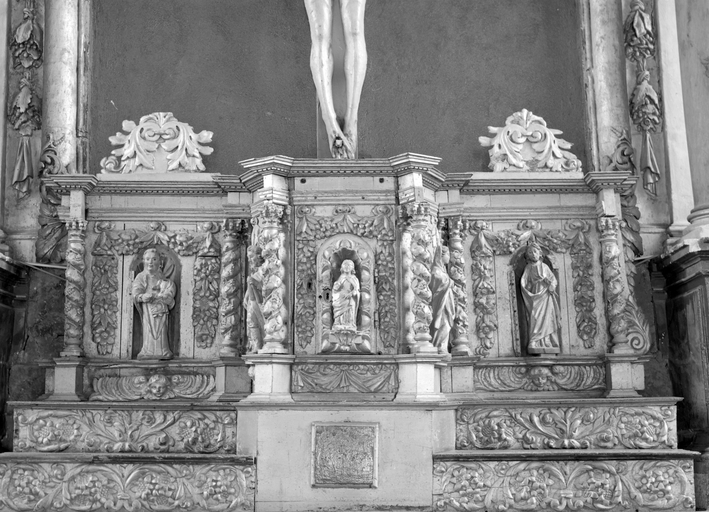 Autel, gradins d'autel (2), tabernacle (maître-autel, tabernacle architecturé), église paroissiale Saint-Caradec (Saint-Caradec-Trégomel),