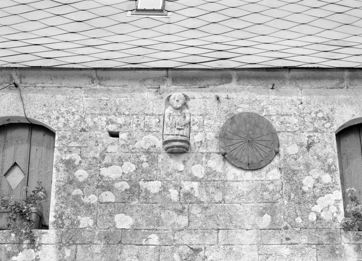 Ferme n°1, logis : décor sculpté et cadran solaire.Immatriculation