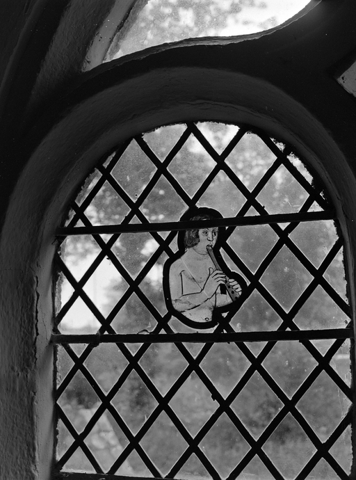 Fragment de vitrail, baie sud : buste d'un personnage jouant à la flûte (cliché Guy Artur, pré-inventaire, 1977)Immatriculation