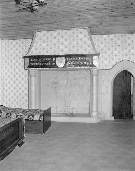 Etage du logis, pièce centrale, vue générale d'une cheminée datée 1418. Etat en 1977.Immatriculation