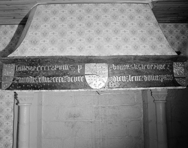 Etage du logis, pièce centrale, détail d'une cheminée qui porte l'inscription suivante "L’an mil quatre cent dix huit, P. Bolloy. K. Levesque avons fait cect oevre. Dieu leur douit pa(ra)dis ". Etat en 1977.Immatriculation