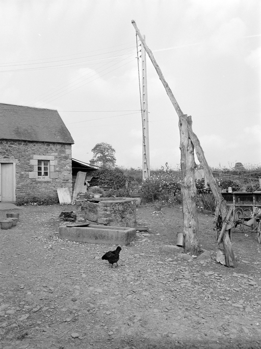 Vue générale nord-est du puits à balancier situé dans la cour nord. Etat en 1977.Immatriculation