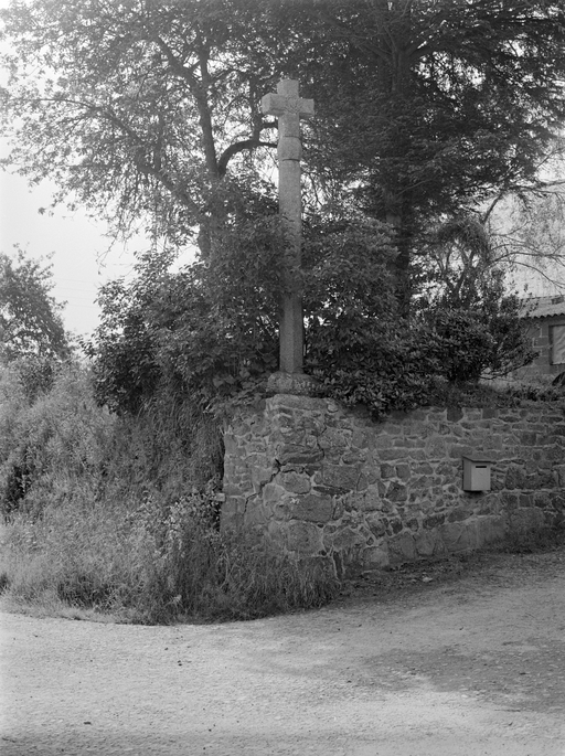 Croix de Kervégan. Vue générale ouest de la croix positionnée sur le muret de la ferme de Kervégan. Etat en 1977.Immatriculation