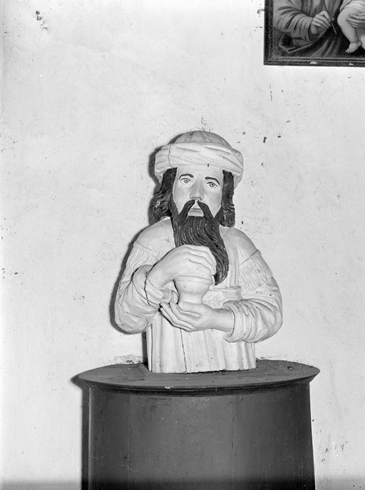 Autel, mur ouest, sud du retable, vue générale d'un buste d'homme (2), de la fin 18e - début 19e siècle, en ronde bosse et bois polychrome. Etat en 1977.Immatriculation