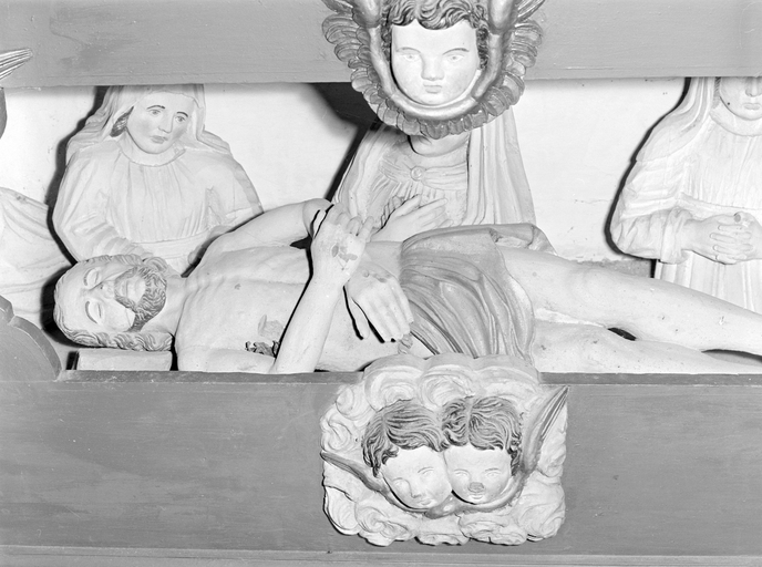Autel, mur ouest, retable, détail du Christ appartenant au groupe sculpté qui représente la mise au tombeau, de la fin du 18e - début 19e siècle, en ronde bosse et bois polychrome. Etat en 1977.Immatriculation