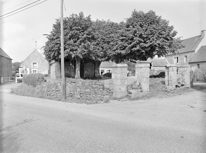 Vue générale, depuis l'est, du mur d'enclos et des piliers d'entrée du placître. Etat en 1977.Immatriculation