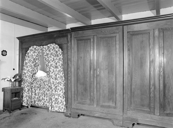 Ensemble de mobilier : lit-clos et armoires identiques alignés (cliché Guy Artur, pré-inventaire, 1977)Immatriculation
