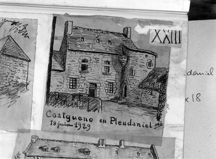 Elévation sud-est du manoir de Coat Guennou (dessin de H. Frotier de la Messelière, 1929)Immatriculation