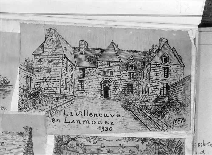Le manoir de la Villeneuve, élévation antérieure d'après croquis du vicomte Henri Frotier de La Messelière daté de l'année 1930 (cliché Alain Dagorn, pré-inventaire, 1977)Immatriculation