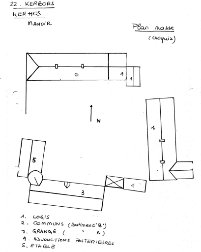 Plan de masse du manoir de Kerhors d'après croquis (pré-inventaire, avril 1977)Immatriculation
