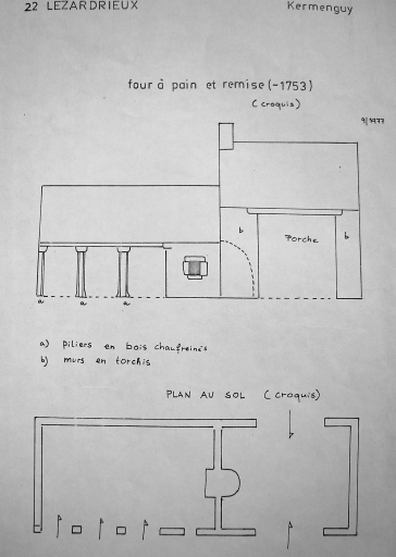 Croquis : four à pain et remise, élévation antérieure sur cour et plan au sol (pré-inventaire, 1977)Immatriculation