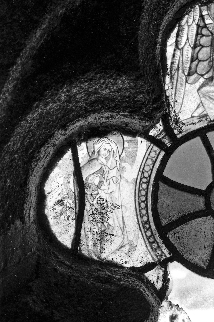 Détail de fragments de vitraux anciens représentant la Vierge dans une scène de l'Annonciation près du choeur (état en 1977)Immatriculation