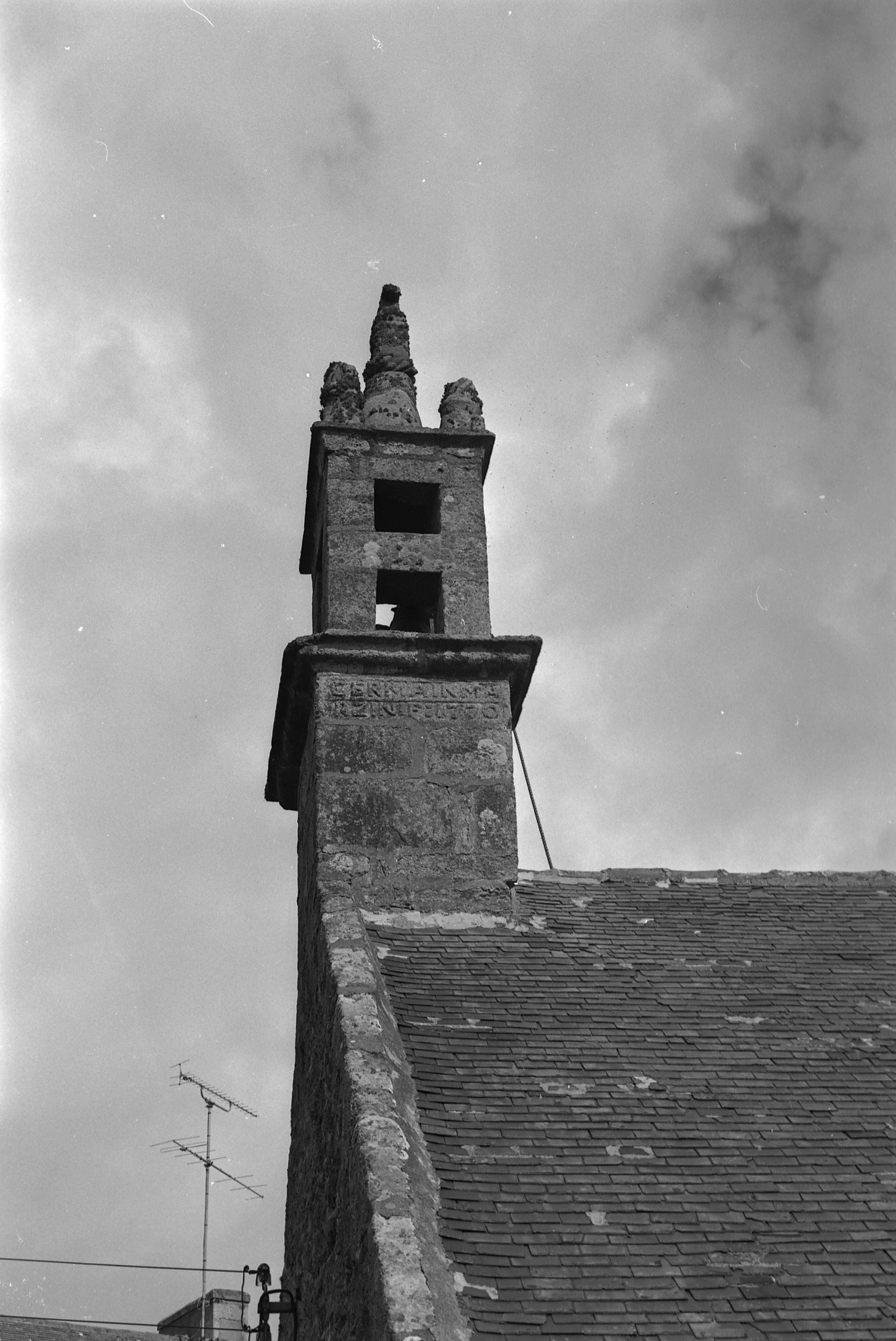Clocher, vue rapprochée du côté sud. Inscription GERMAIN MARZIN : F : 1770. (1977)Immatriculation