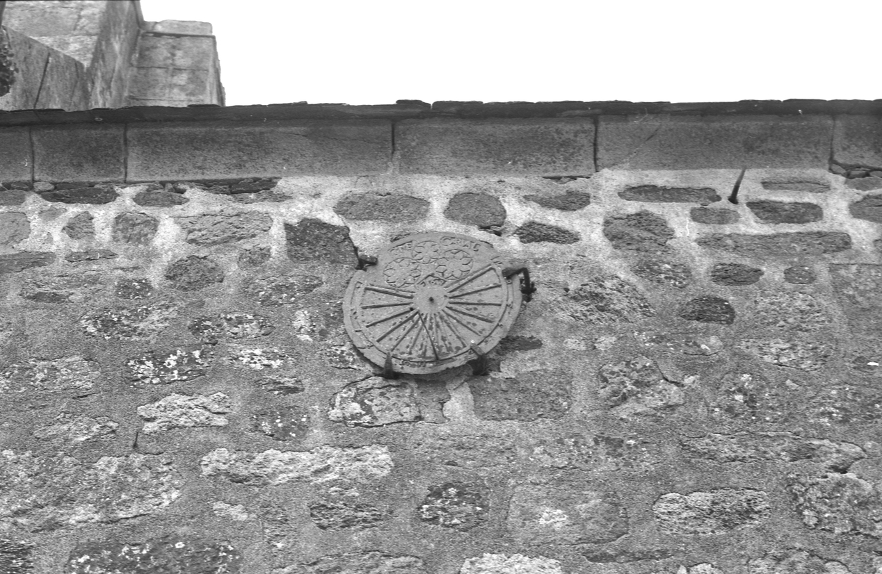 Cléden-Cap-Sizun, ferme. Cadran solaire daté 1768 sur la façade antérieure du logis. Inscription : G:ME CARVAL. Vue rapprochée. (1977)Immatriculation