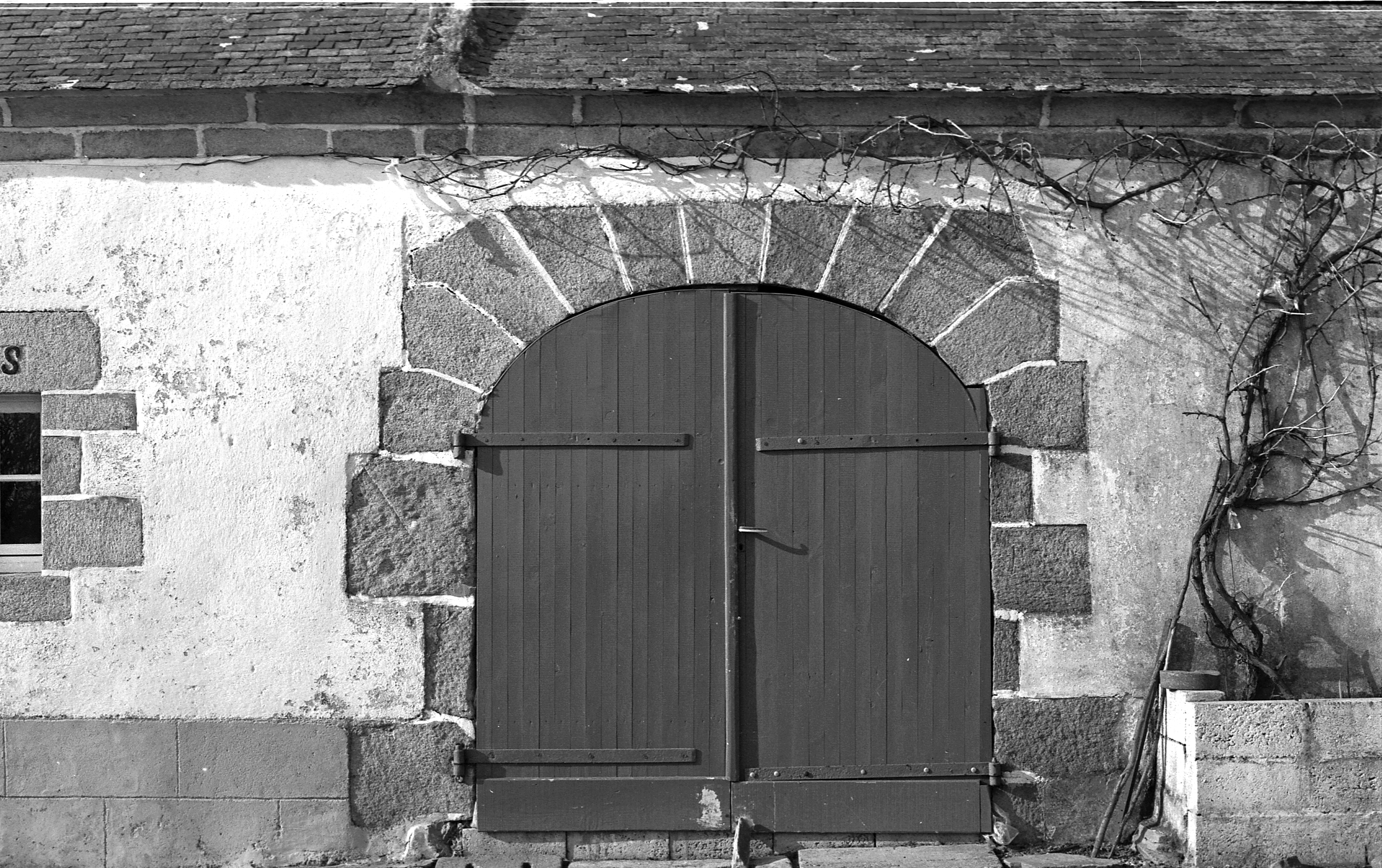 Grange, élévation antérieure, détail de la porte. (1977)Immatriculation