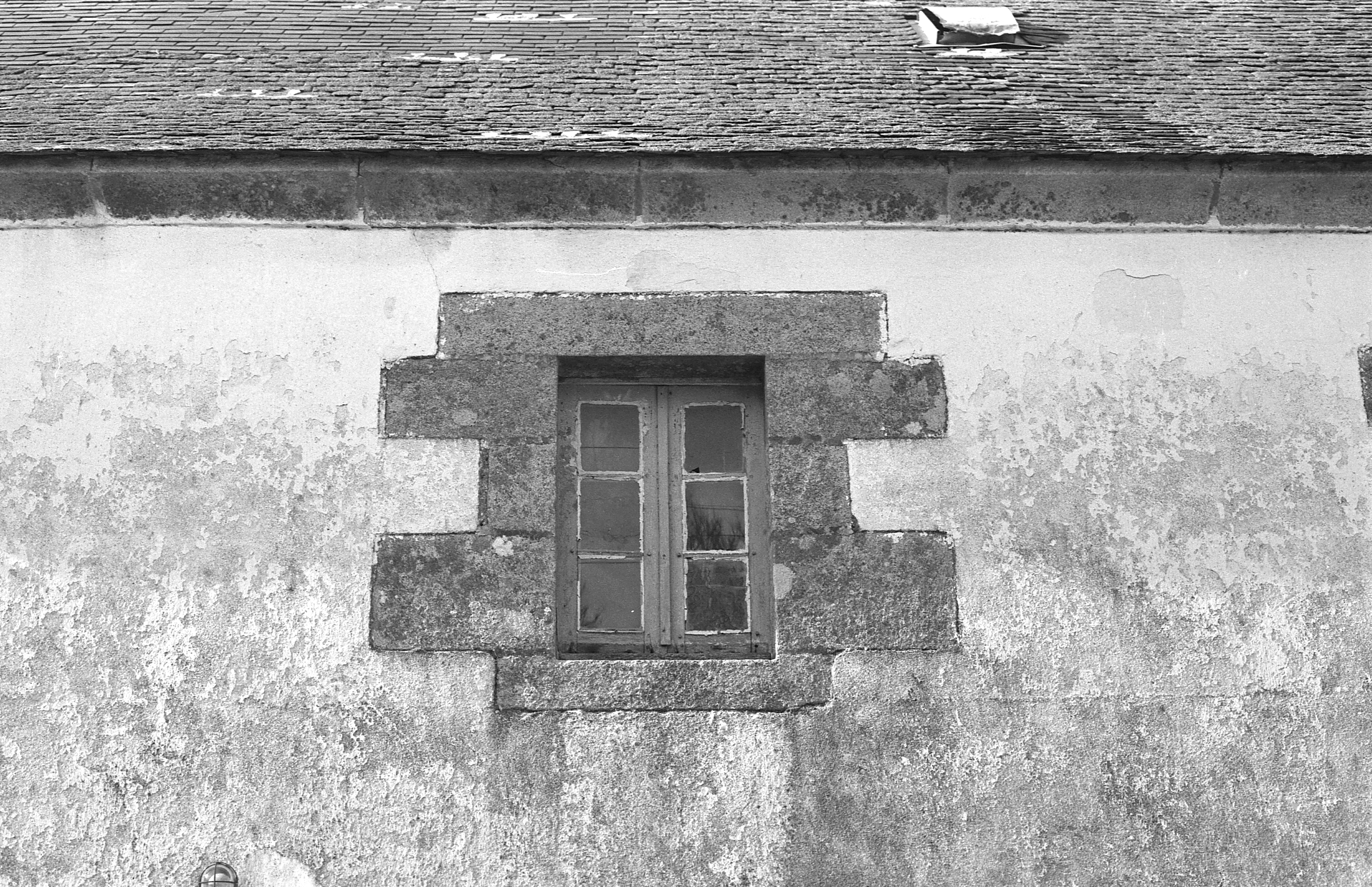 Ferme 4, logis daté 1842, détail d'une fenêtre de l'étage et de la corniche du toit moulurée en cavet. (1977)Immatriculation
