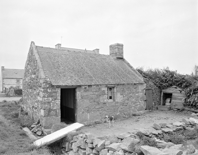 Elévation antérieure du logis et de sa crèche en appentis, vue prise du chemin menant au village. (1977)Immatriculation